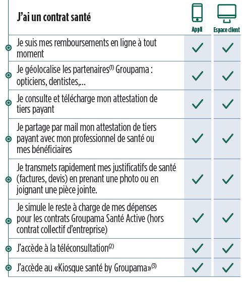 Bénéficiez de la télémédecine, avec Groupama Santé Active : 6 téléconsultations prises en charge par an et par ayant droit : Sans avance de frais Depuis la France ou l’étranger 24h/24h et 7j/7 Simplifiez vos démarches Santé avec nos services digitaux : Retrouvez l’ensemble de nos services digitaux